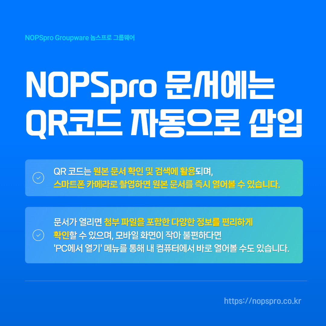 이럴 때는 NOPSpro의 ‘PC에서 열기’ 기능을 활용하면 됩니다. 모바일에서 QR 코드로 문서를 확인한 뒤, 클릭 한 번으로 동일한 문서를 PC 화면에서 바로 이어서 열 수 있습니다. 외부에서는 빠르게 확인하고, 사무실에서는 본격적으로 작업을 이어가는 흐름이 자연스럽게 연결되는 것이죠. NOPSpro의 QR 코드 문서 기능은 단순한 편의 기능을 넘어, 문서를 더 효율적으로 활용할 수 있도록 돕는 스마트한 문서 관리 방식이라 할 수 있습니다.